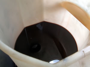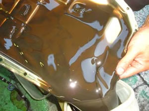 最初にATFを少量抜き、交換できる状態のATFであるか否かを判断します。 大概のミッションは、新車から走行距離が2万キロほどでこの写真のように墨汁状態のATFとなってしまいます。