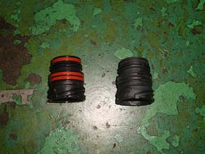 さてさて、ミッションには、ECU同士で信号をやりとりするためのハーネスが接続されております。 そのハーネスを、ミッションの内部から外部に通すために、左の写真のスリーブを使用しています。