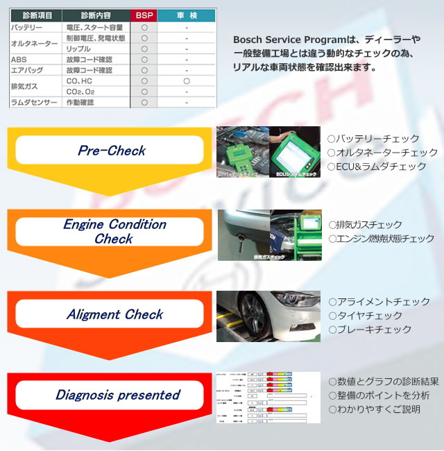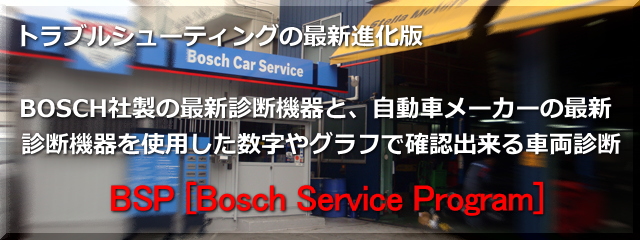 一般的な点検整備では、メカニックの経験や勘を中心に静的な状態で進められてきました。 [Bosch Service Program]は、常時プログラム更新があるドイツBOSCH社の最新機器と、各自動車メーカーの診断機を駆使して、「静的」な状態に加えて「動的」にあなたのクルマを診断します。