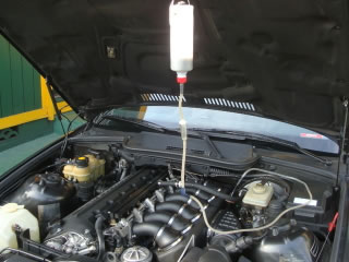 こんな感じで、点滴のような機材で30分ほどかけてエンジンに注入していきます。